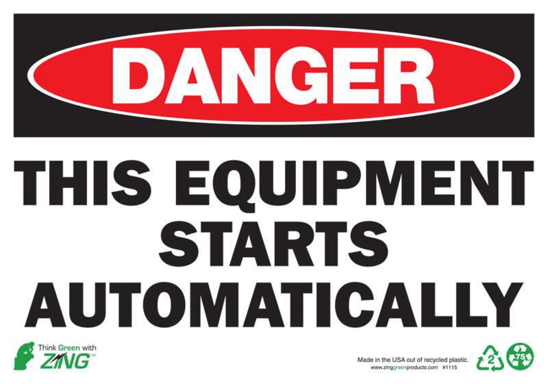 Sign Danger This Equipment Plastic 10X14In^ Danger Sign, Recycled Plastic, Equipment Starts Automatically, Pre-Drilled Mounting Holes & Adhesive Tabs, Impact And Uv Resistant, Ul Validated For Recycled Content, 10X14I