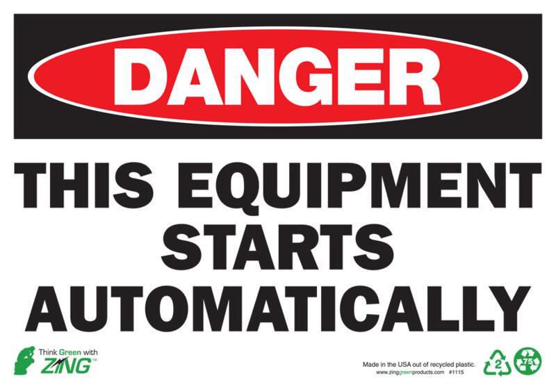 Sign Danger This Equipment Plastic 7X10In^ Danger Sign, Recycled Plastic, Equipment Starts Automatically, Pre-Drilled Mounting Holes & Adhesive Tabs, Impact And Uv Resistant, Ul Validated For Recycled Content, 7X10I