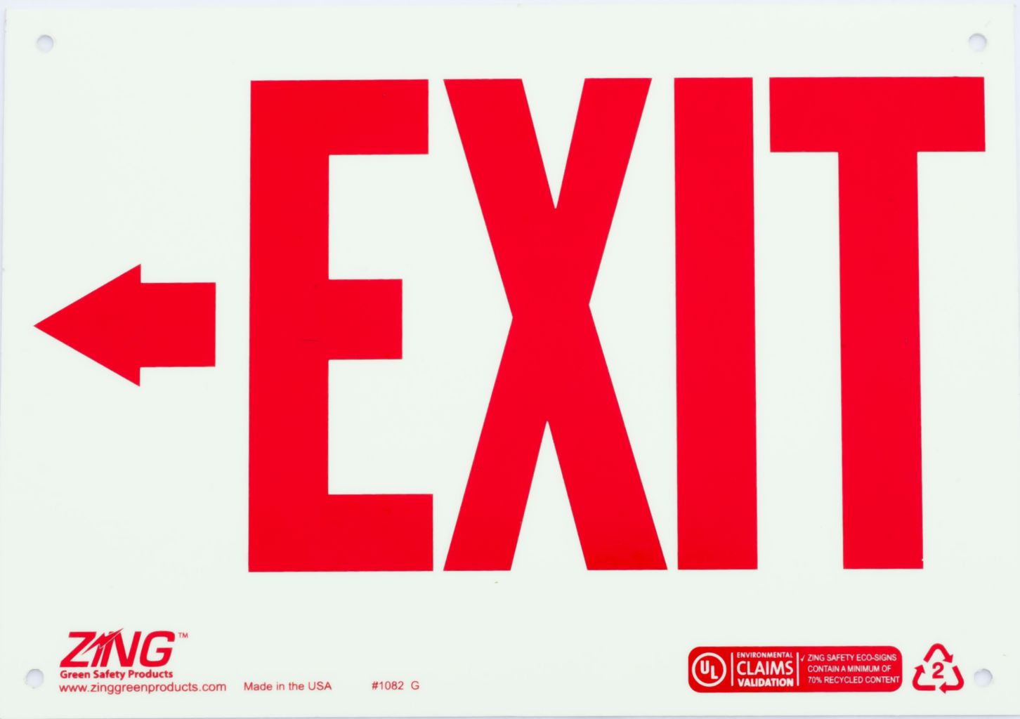 Sign Exit Left Arrow Glow Plastic 10X14In^ Exit Sign, Recycled Plastic, Glow In The Dark, Exit W/Left Arrow, Pre-Drilled Mounting Holes & Adhesive Tabs, Illuminates For Over 10 Hours To Exceed Astme 2072-00 Standards, Ul Validated For Recycled Content, 10X14I