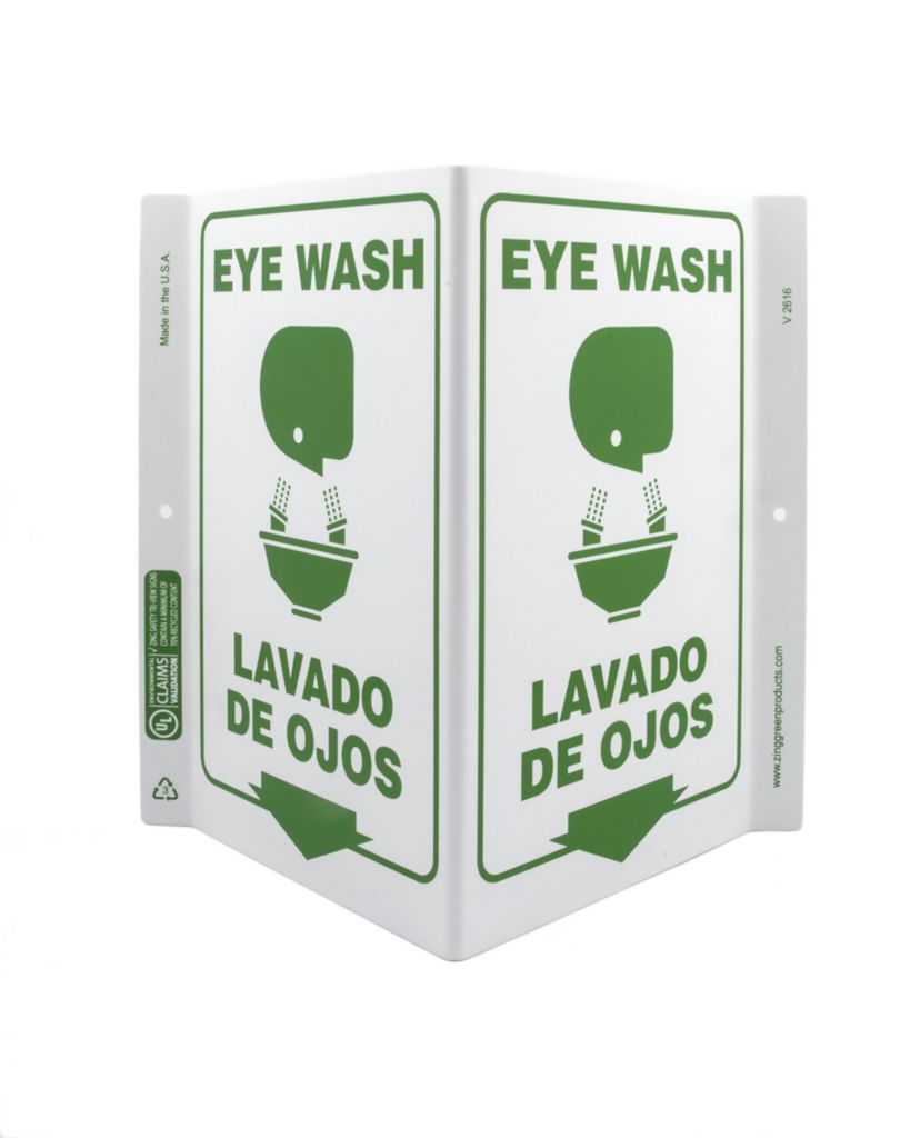 Sign Eye Wash/Lavado De Plastic 11X106In^ Safety Sign, Recycled Plastic, Eye Wash Bilingual, 2 Sided V Shaped Projecting Provides Greater Visibility, Pre-Drilled Mounting Holes & Adhesive Tabs, Impact And Uv Resistant, Ul Validated Recycled Content, 11X10.6I