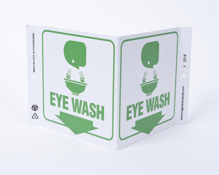 Sign Eye Wash Plastic 7X12In^ Safety Sign, Recycled Plastic, Eye Wash, 2 Sided V Shaped Projecting Provides Greater Visibility, Pre-Drilled Mounting Holes & Adhesive Tabs, Impact And Uv Resistant, Ul Validated For Recycled Content, 7X12I