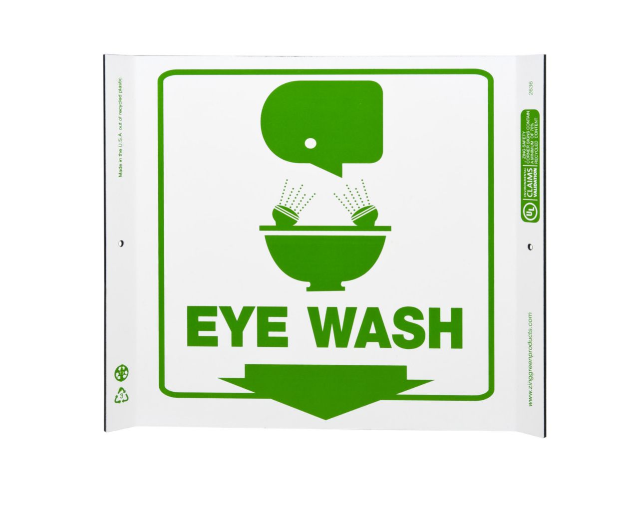 Sign Eye Wash Plastic 10X10In^ Safety Sign, Recycled Plastic, Eye Wash, Unique Projecting Corner Mount Provides Greater Visibility, Pre-Drilled Mounting Holes & Adhesive Tabs, Impact And Uv Resistant, Ul Validated For Recycled Content, 10X10I