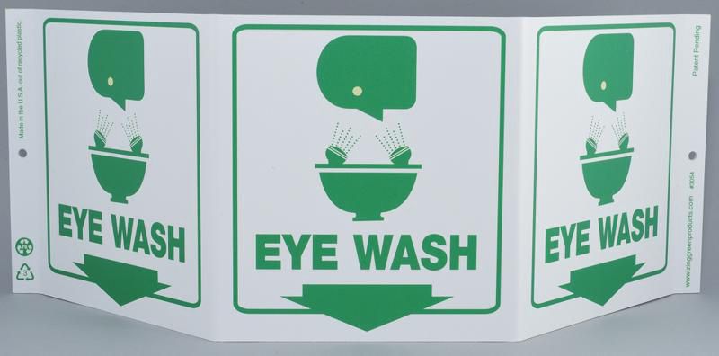Sign Eye Wash Plastic 75X20In^ Safety Sign, Recycled Plastic, Eye Wash, Triview 3 Sided Projecting Provides Greater Visibility, Pre-Drilled Mounting Holes & Adhesive Tabs, Impact And Uv Resistant, Ul Validated For Recycled Content, 7.5X20I