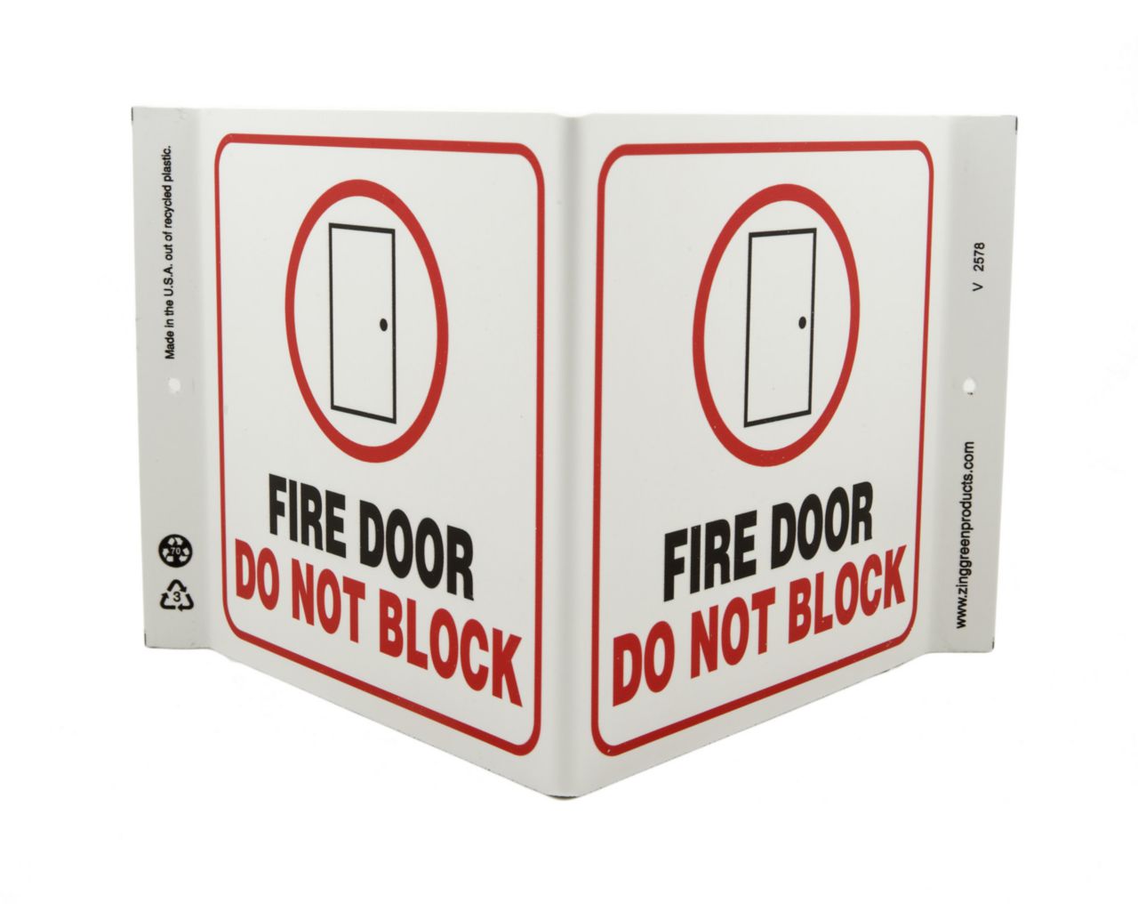 Sign Fire Door Do Plastic 7X12In^ Fire Sign, Recycled Plastic, Fire Door Do Not Block, 2 Sided V Shaped Projecting Provides Greater Visibility, Pre-Drilled Mounting Holes & Adhesive Tabs, Impact And Uv Resistant, Ul Validated For Recycled Content, 7X12I