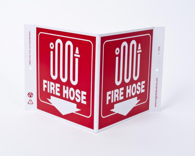 Sign Fire Hose Plastic 7X12In^ Fire Sign, Recycled Plastic, Fire Hose, 2 Sided V Shaped Projecting Provides Greater Visibility, Pre-Drilled Mounting Holes & Adhesive Tabs, Impact And Uv Resistant, Ul Validated For Recycled Content, 7X12I