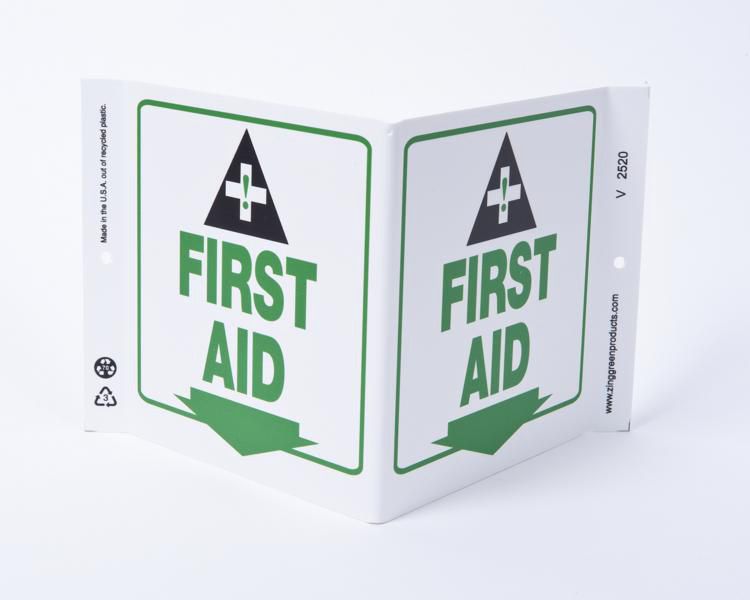Sign First Aid Plastic 7X12In^ Safety Sign, Recycled Plastic, First Aid, 2 Sided V Shaped Projecting Provides Greater Visibility, Pre-Drilled Mounting Holes & Adhesive Tabs, Impact And Uv Resistant, Ul Validated For Recycled Content, 7X12I
