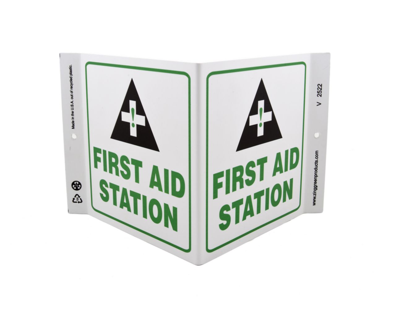 Sign First Aid Station Plastic 7X12In^ Safety Sign, Recycled Plastic, First Aid Station, 2 Sided V Shaped Projecting Provides Greater Visibility, Pre-Drilled Mounting Holes & Adhesive Tabs, Impact And Uv Resistant, Ul Validated For Recycled Content, 7X12I