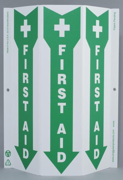 Sign First Aid Plastic 12X9In^ Safety Sign, Recycled Plastic, First Aid, Triview 3 Sided Projecting Provides Greater Visibility, Pre-Drilled Mounting Holes & Adhesive Tabs, Impact And Uv Resistant, Ul Validated For Recycled Content, 12X9I