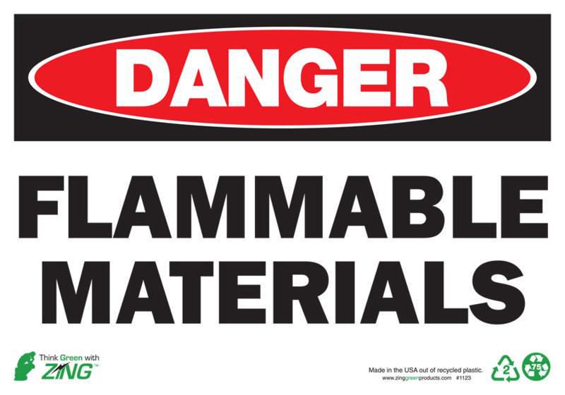 Sign Danger Flammable Materials Pl 10X14In^ Danger Sign, Recycled Plastic, Flammable Materials, Pre-Drilled Mounting Holes & Adhesive Tabs, Impact And Uv Resistant, Ul Validated For Recycled Content, 10X14I