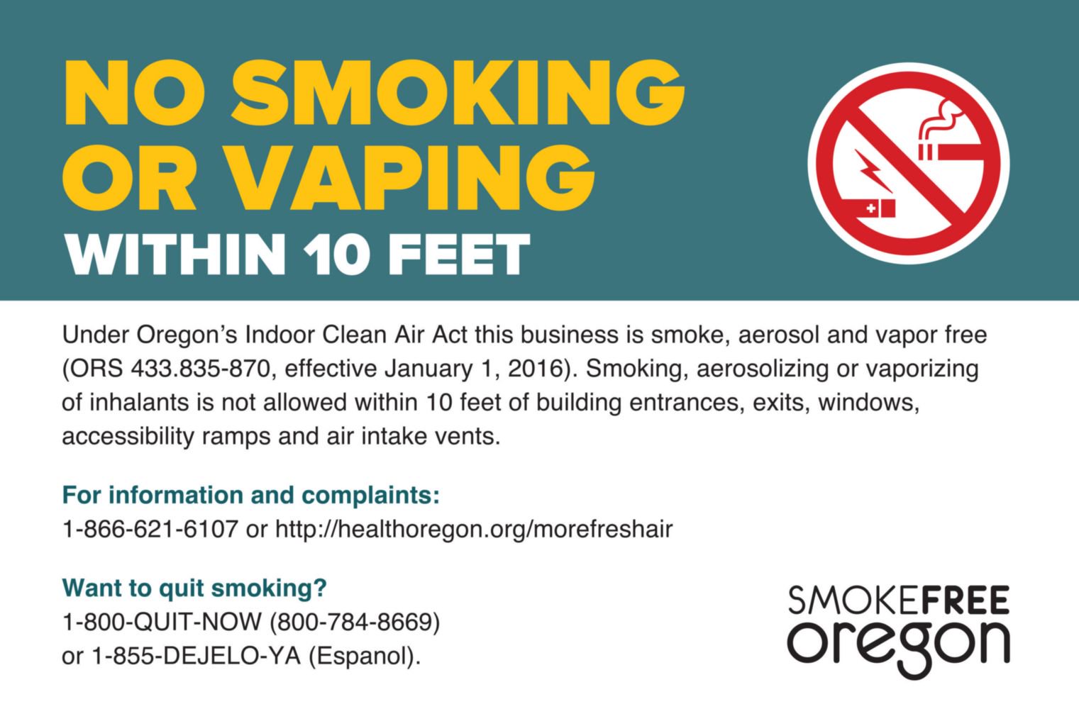 SIGN NO SMOKING OREGON PLASTIC 10X14IN , Each