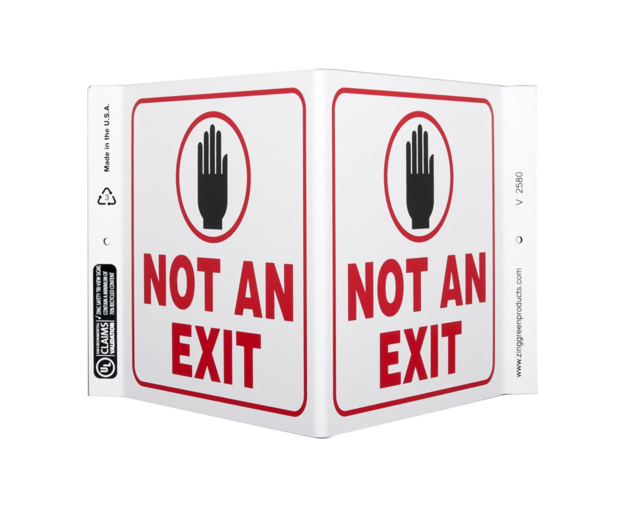 Sign Not An Exit Plastic 7X12In^ Exit Sign, Recycled Plastic, Not An Exit, 2 Sided V Shaped Projecting Provides Greater Visibility, Pre-Drilled Mounting Holes & Adhesive Tabs, Impact And Uv Resistant, Ul Validated For Recycled Content, 7X12I