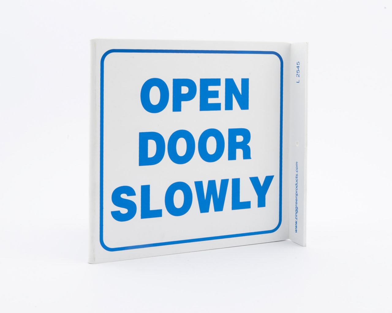 Sign Open Door Slowly Plastic 7X7In^ Safety Sign, Recycled Plastic, Open Door Slowly, 2 Sided L Shaped Projecting Provides Greater Visibility, Pre-Drilled Mounting Holes & Adhesive Tabs, Impact And Uv Resistant, Ul Validated For Recycled Content, 7X7I