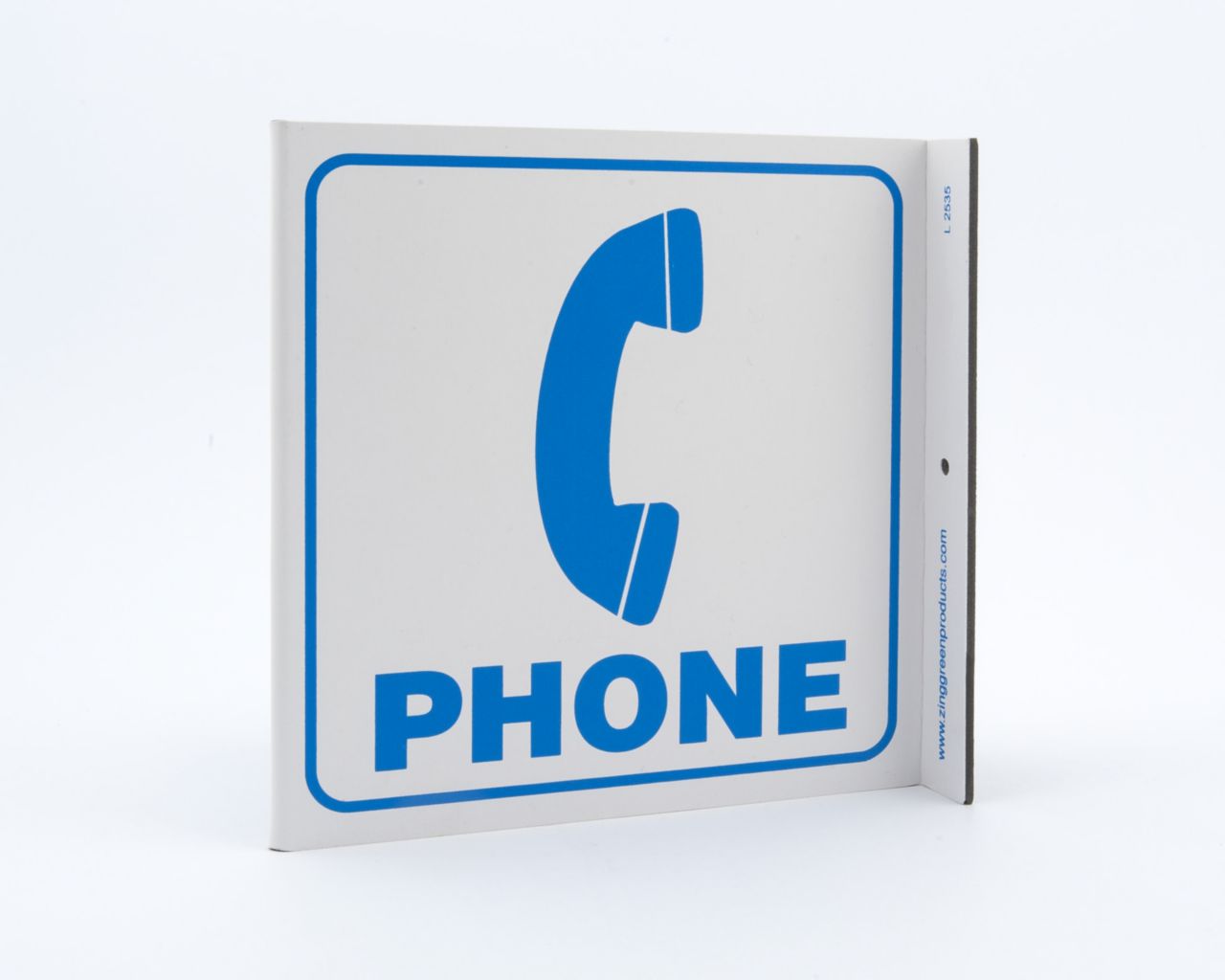 Sign Phone Plastic 7X7In^ Facility Sign, Recycled Plastic, Phone, 2 Sided L Shaped Projecting Provides Greater Visibility, Pre-Drilled Mounting Holes & Adhesive Tabs, Impact And Uv Resistant, Ul Validated For Recycled Content, 7X7I