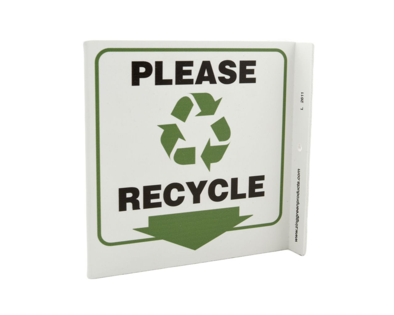Sign Please Recycle Plastic 7X7In^ Facility Sign, Recycled Plastic, Please Recycle, 2 Sided L Shaped Projecting Provides Greater Visibility, Pre-Drilled Mounting Holes & Adhesive Tabs, Impact And Uv Resistant, Ul Validated For Recycled Content, 7X7I
