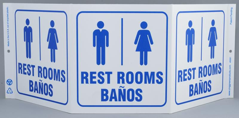 Sign Rest Rooms/Banos Plastic 75X20In^ Facility Sign, Recycled Plastic, Bilingual, Restrooms, Triview 3 Sided Projecting Provides Greater Visibility, Pre-Drilled Mounting Holes & Adhesive Tabs, Impact And Uv Resistant, Ul Validated Recycled Content, 7.5X20I