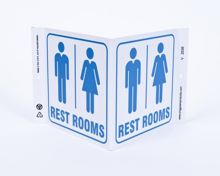 Sign Rest Rooms Plastic 7X12In^ Facility Sign, Recycled Plastic, Rest Rooms, 2 Sided V Shaped Projecting Provides Greater Visibility, Pre-Drilled Mounting Holes & Adhesive Tabs, Impact And Uv Resistant, Ul Validated For Recycled Content, 7X12I