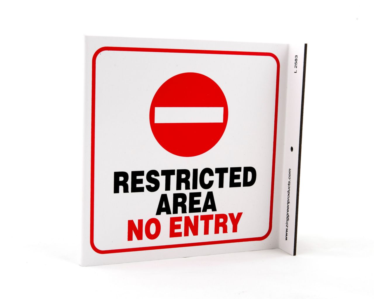 Sign Restricted Area No Plastic 7X7In^ Safety Sign, Recycled Plastic, Restricted Area, 2 Sided L Shaped Projecting Provides Greater Visibility, Pre-Drilled Mounting Holes & Adhesive Tabs, Impact And Uv Resistant, Ul Validated For Recycled Content, 7X7I