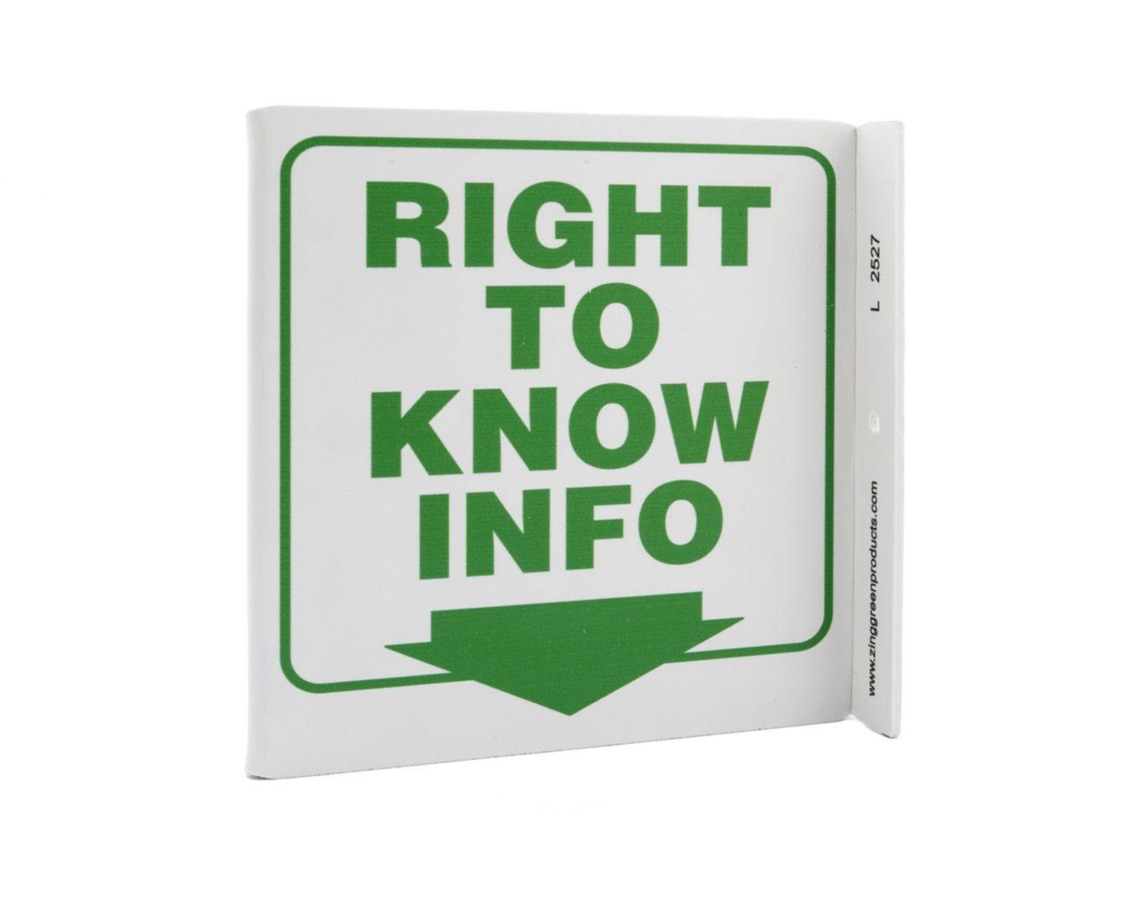 Sign Right To Know Plastic 7X7In^ Safety Sign, Recycled Plastic, Right To Know Info, 2 Sided L Shaped Projecting Provides Greater Visibility, Pre-Drilled Mounting Holes & Adhesive Tabs, Impact And Uv Resistant, Ul Validated For Recycled Content, 7X7I