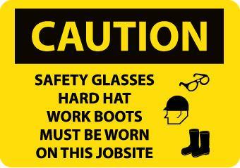 Caution, Safety Glasses Hard Hat Work Boots Must Be Worn On This Jobsite, Graphic, 14X20, Rigid Plastic^