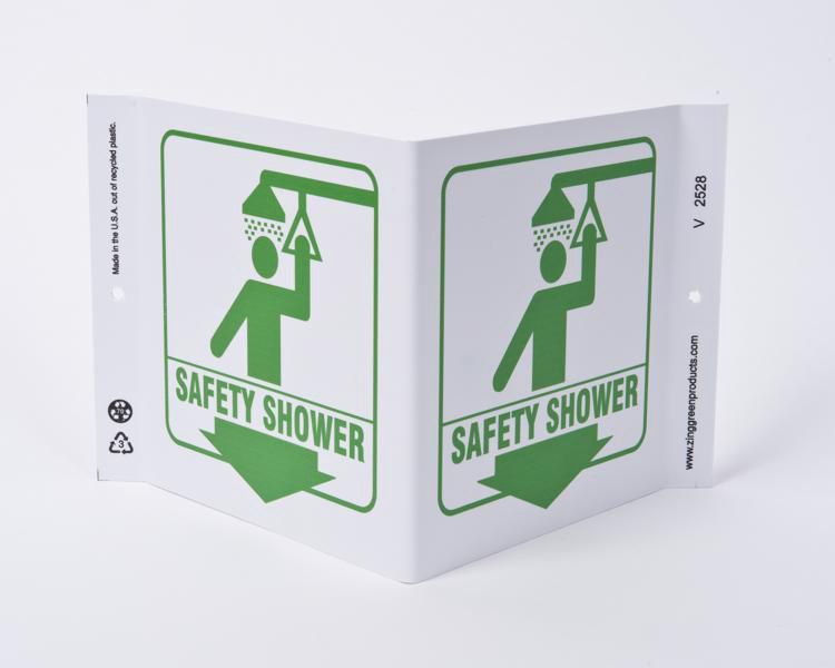 Sign Safety Shower Plastic 7X12In^ Safety Sign, Recycled Plastic, Safety Shower, 2 Sided V Shaped Projecting Provides Greater Visibility, Pre-Drilled Mounting Holes & Adhesive Tabs, Impact And Uv Resistant, Ul Validated For Recycled Content, 7X12I
