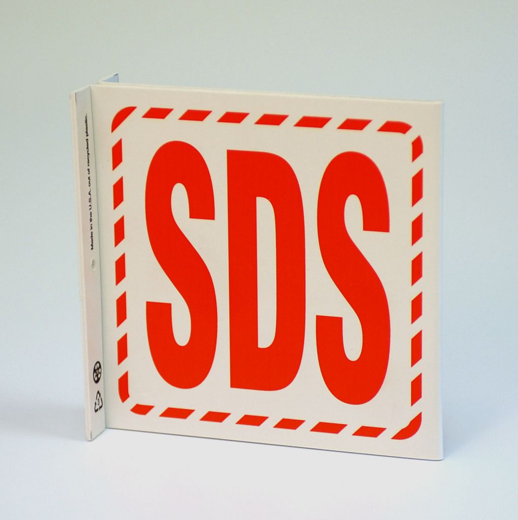 Sign Sds Plastic 7X7In^ Ghs/Hazcom Sign, Recycled Plastic, Sds, 2 Sided L Shaped Projecting Provides Greater Visibility, Pre-Drilled Mounting Holes & Adhesive Tabs, Impact And Uv Resistant, Ul Validated For Recycled Content, 7X7I
