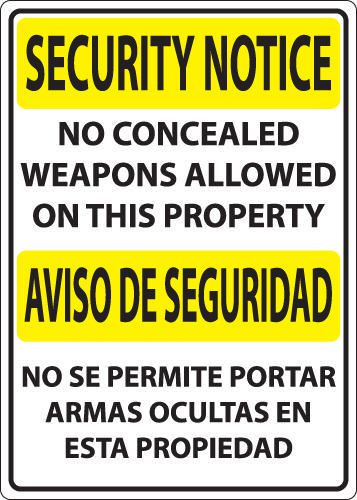 Sign Security Notice No Aluminium 14X10In^ Concealed Carry & Weapons Sign, Recycled Aluminum, Security No Weapons, Bilingual, Pre-Drilled Mounting Holes, Durable Indoor And Outdoor Use With Uv Protection, Ul Validated For Recycled Content, 14X10I