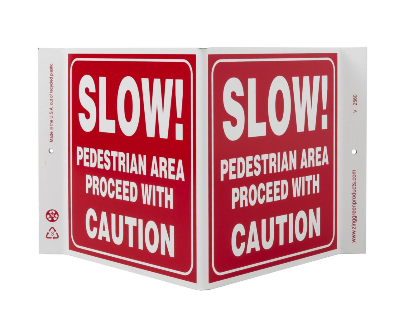 Sign Slow Pedestrian Area Plastic 7X12In^ Safety Sign, Recycled Plastic, Slow Pedestrian Area, 2 Sided V Shaped Projecting Provides Greater Visibility, Pre-Drilled Mounting Holes & Adhesive Tabs, Impact And Uv Resistant, Ul Validated For Recycled Content, 7X12I