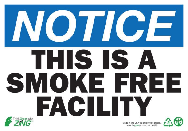 Sign Notice This Is Plastic 10X14In^ Notice Sign, Recycled Plastic, This Is A Smoke Free Facility, Pre-Drilled Mounting Holes & Adhesive Tabs, Impact And Uv Resistant, Ul Validated For Recycled Content, 10X14I