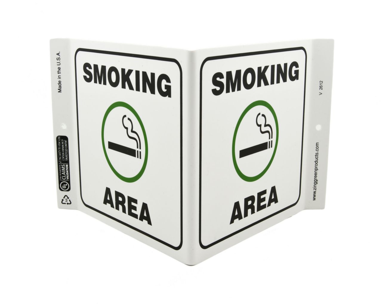 Sign Smoking Area Plastic 7X12In^ Safety Sign, Recycled Plastic, Smoking Area, 2 Sided V Shaped Projecting Provides Greater Visibility, Pre-Drilled Mounting Holes & Adhesive Tabs, Impact And Uv Resistant, Ul Validated For Recycled Content, 7X12I