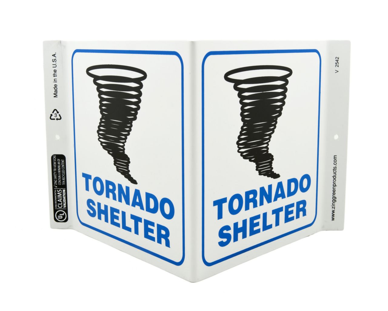 Sign Tornado Shelter Plastic 7X12In^ Safety Sign, Recycled Plastic, Tornado Shelter, 2 Sided V Shaped Projecting Provides Greater Visibility, Pre-Drilled Mounting Holes & Adhesive Tabs, Impact And Uv Resistant, Ul Validated For Recycled Content, 7X12I