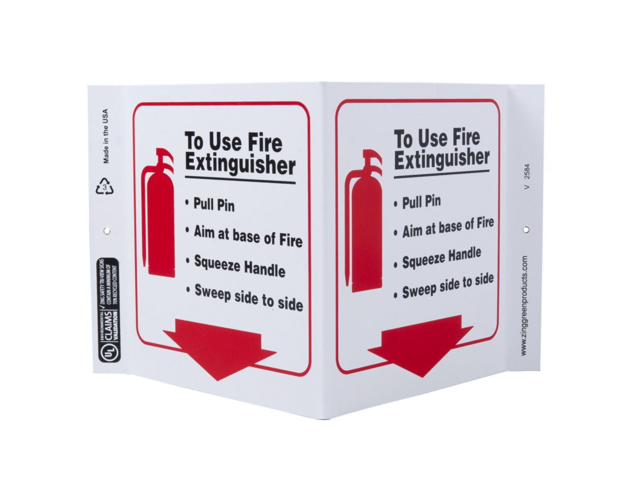 Sign To Use Fire Plastic 7X12In^ Fire Sign, Recycled Plastic, Use Fire Extinguisher, 2 Sided V Shaped Projecting Provides Greater Visibility, Pre-Drilled Mounting Holes & Adhesive Tabs, Impact And Uv Resistant, Ul Validated For Recycled Content, 7X12I
