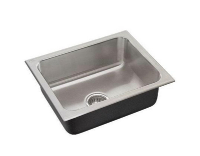 Single Compartment Sink without Ledge^ Type 304, 18-8 stainless steel. Features polished interior and top surfaces. Thoroughly sound deadened. Punched-in center receives cup strainer. Constructed without faucet ledge to fit narrow counters. OD: 43.1x48.2cm. ID: 35.5x40.6cm. Depth: 19cm.