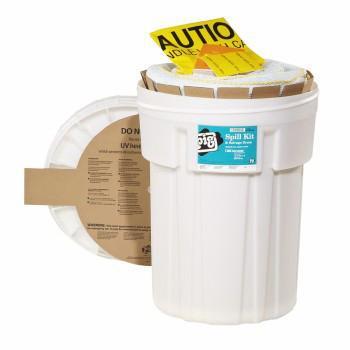 PIG* Spill Kit in a 30-gallon Overpak Salvage Drum^Skimming Kit - an assortment of PIG* products to absorb oil only, not water. Packed inside chemical- and water-resistant polyethylene Overpak. Half-turn lids. Empty 30-gallon Overpak is UN-specified for use. Absorbs up to 21 gallons.