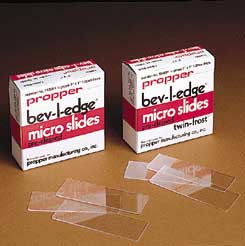 Plain Bev-L-Edge* Microscope Slides^ All eight edges ground and bevelled for uniform smear and to prevent finger cuts. Rounded corners for insertion into slide mailer/file box. Made of first-quality, noncorrosive, and nonfogging glass. Size: 76.2x25.4mm. Thickness: 0.9 to 1.0mm.