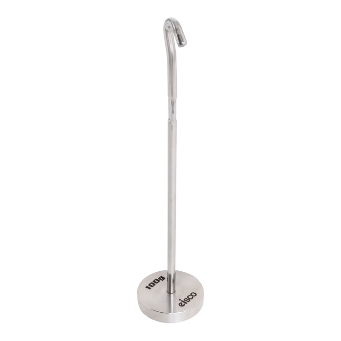ull; Stainless steel hanger weighing 100g • Supports stainless steel slotted masses up to 100g (Eisco part numbers PHMSSS01-PHMSSS07) • Overall height measures 6.5 inches • Length of mass placement section (bottom of hook to top of base) measures 4.5 inches • Base diameter measure 1.57 inches. This premium quality, durable stainless steel slotted masses hanger weighs 100g and supports stainless steel slotted masses up to 100g (item numbers (PHMSSS01 through PHMSSS07). Overall height from top of hook to bottom of base measures 6.5" tall, 4.5" of which accommodates mass placement. A 1.57" diameter base provides added stability.