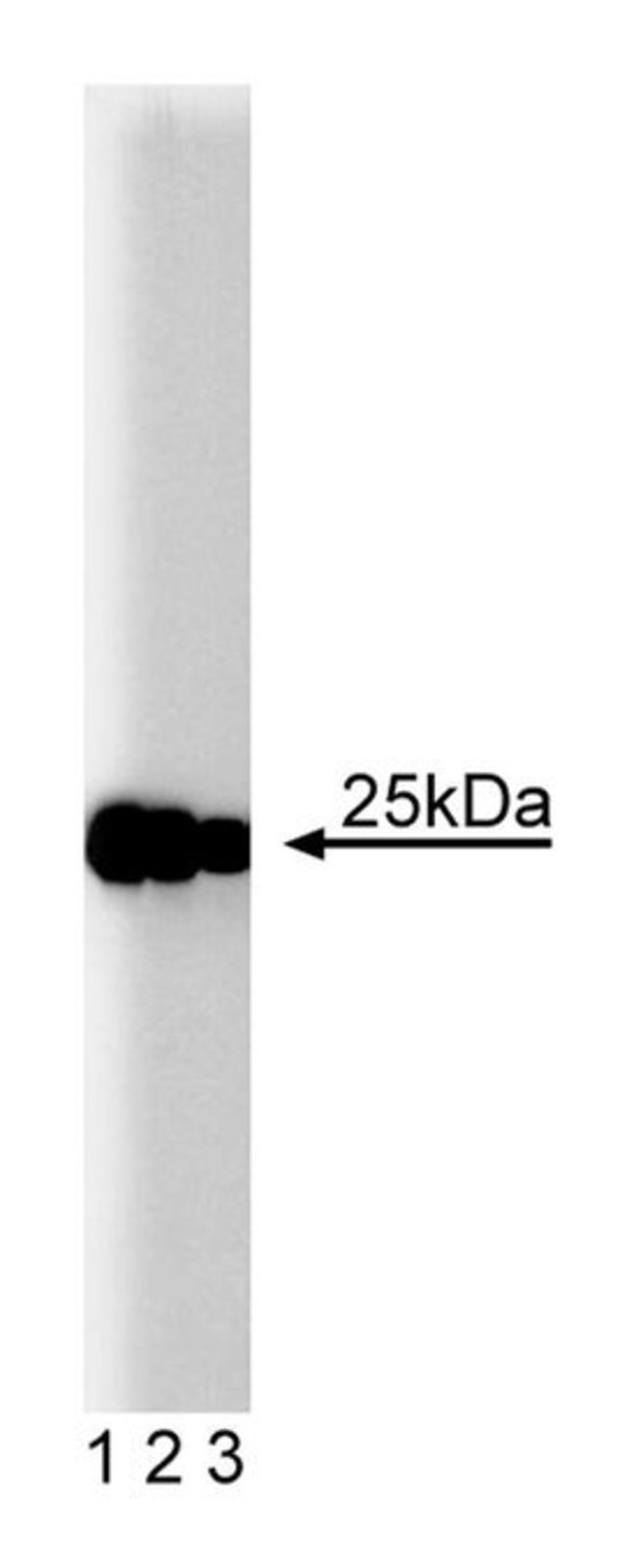 Release of neurotransmitters from neurons is regulated by exocytosis of synaptic vesicles. This exocytosis is mediated by a complex consisting of membrane components of both the synaptic vesicle and the synaptic plasma membrane. The fusion complex consists of the soluble NSF (N-ethyl-maleimide-sensitive factor) and SNAPs (soluble NSF attachment proteins), along with the receptor proteins (known as SNAREs) synaptobrevin, synaptotagmin, syntaxin, and SNAP-25 (synaptosomal-associated protein of 25kDa- the name is coincidental to the previously mentioned “SNAP” terminology). SNAP-25 and syntaxin are plasmalemmal proteins (designated as t-SNAREs) while synaptobrevin and synaptotagmin are vesicular proteins (designated as v-SNAREs). These four proteins are thought to constitute an initial SNARE docking complex for regulated exocytosis. SNAP-25 lacks a transmembrane domain, but is linked to the membrane by palmitoylated cysteine residues in the central region of the molecule.Immunofluorescence, Immunoprecipitation, Western Blotting