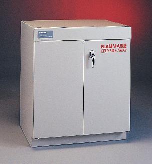 Protector* Solvent Storage Cabinet^ Dual hinge. Automatic self-closing doors. Safely stores and vents solvents and other flammable liquids. Dual-wall white epoxy-coated steel construction with 3.8cm air gap, and fiberglass insulation for complete protection. 90Hx90Wcm. Meets OSHA and NFPA.