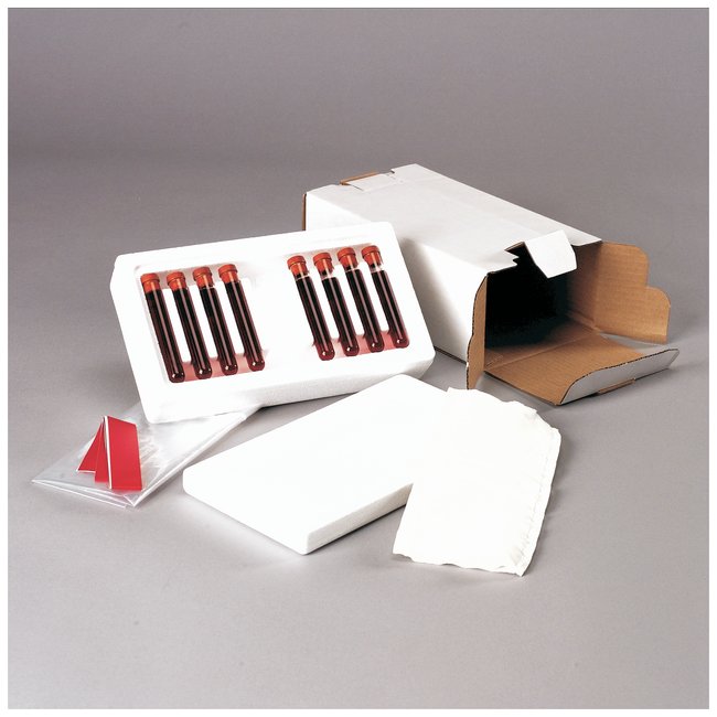 Leak-resistant, EPS foam mailer holds 30mL bottle, eight 10mL tubes, materials for insurance testing and other paperwork