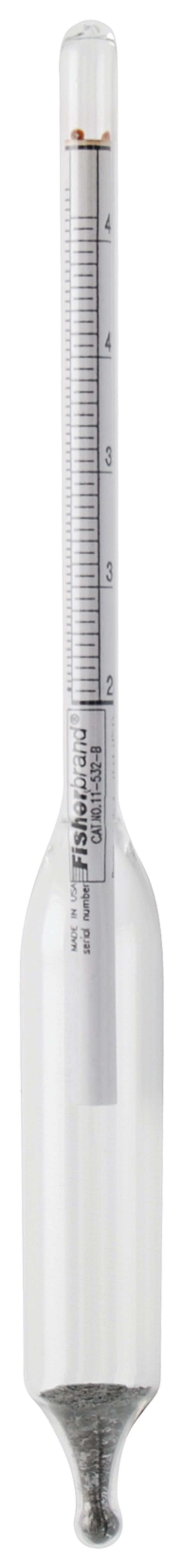 Fisherbrand™ Specific Gravity/Baume Hydrometers are calibrated according to ASTM™ E 126 specifications.Permanently marked with individual serial numbersOrder InfoA certificate of calibration is available; simply add the letter “C” to the end of the catalog number when ordering.CertificationsCertificate of Accuracy and Compliance provided to indicate calibration against standards provided by NIST™.ComplianceAccuracy meets or exceeds ASTM™ E 100 specificatio