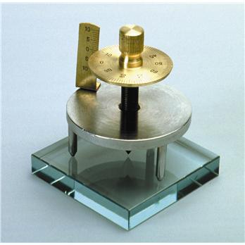 A fine instrument for determining the radius of curvature of spherical surfaces such as mirrors and lenses. Its micrometer screw is graduated to measure displacement as small as 0.01mm. The instrument has two brass plates and three steel legs. A flat glass plate is provided for support while taking precision readings.