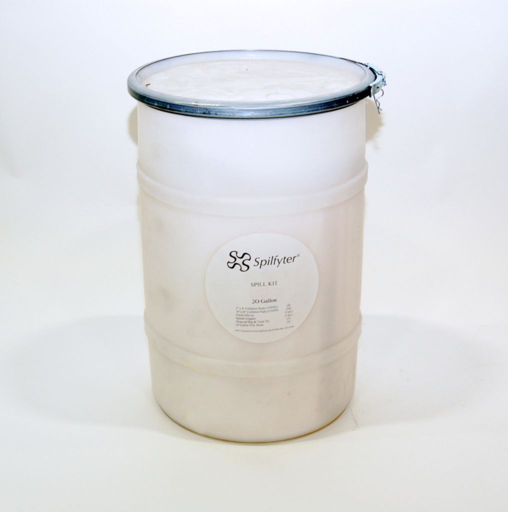 Hazmat 20-gallon Spill Kit^ All materials are poly-bagged and heat-sealed for cleanroom use. Contents: (5) 3in.x4ft. socks, (100) 16in.x18in. pads, (1) disposal bag & twist tie, (1pr.) nitrile gloves, (1pr.) splash goggles, (1) 20-gallon poly drum, (1) emergency response guidebook.