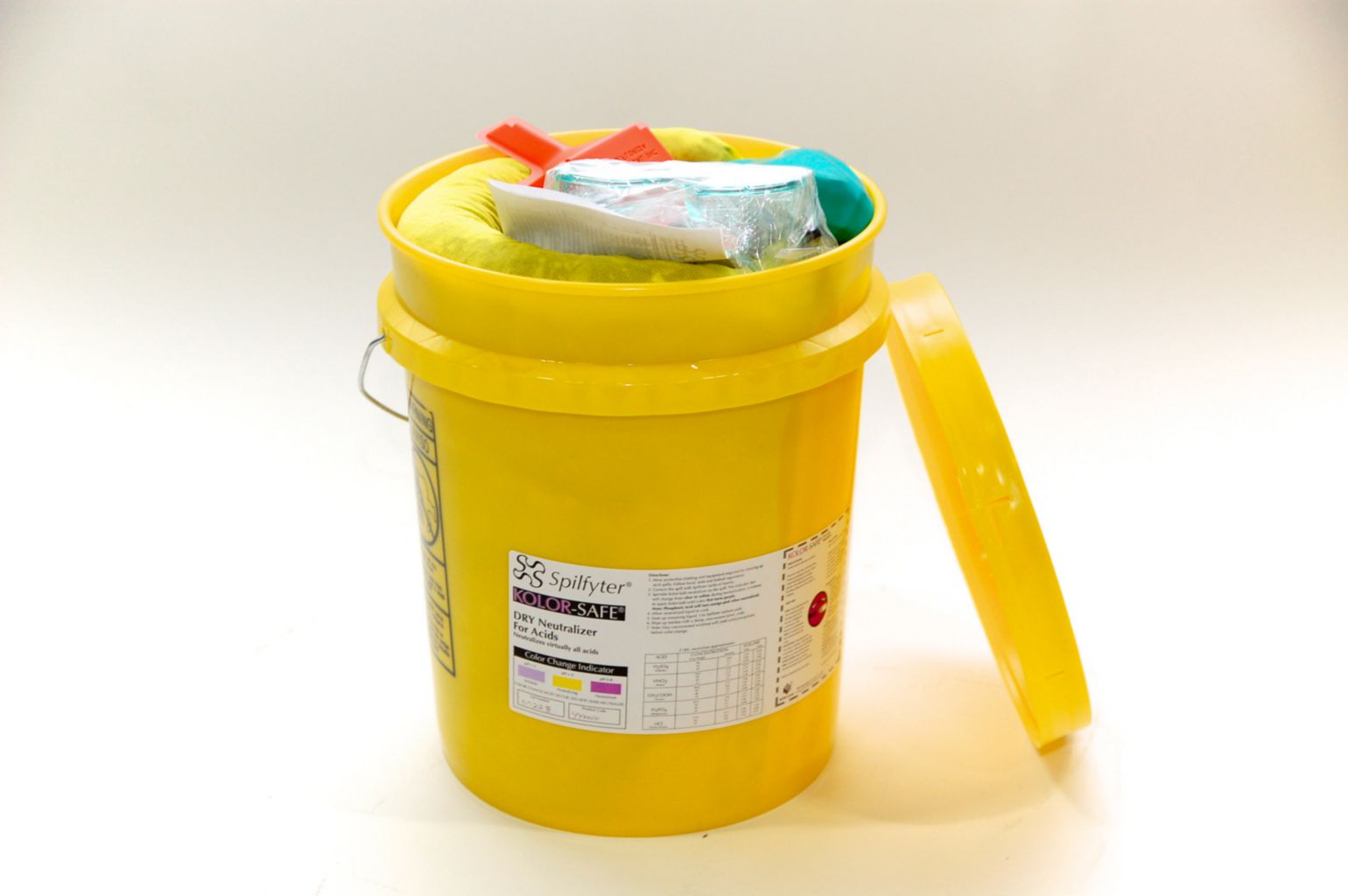 Grab & Go* Spill Kit For Acids (Dry)^ Contents: 3In.X4Ft. Hazmat Socks, 12In.X12In.Hazmat Pads, Kolor-Safe* Dry Acid Neutralizer, Scoop With Detachable Scraper, Gloves, Splash Goggles, Chemical Classifier Strips, Chemical Classifier Chart, Disposal Bag, 5-Gallon Bucket With Snap-On Lid.