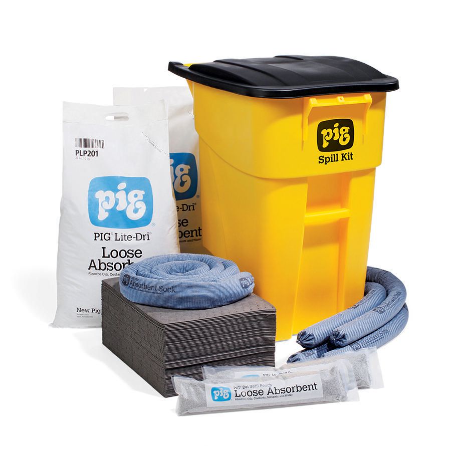 Spill Kit 37 gallon^ Spill Kit in High-Visibility Mobile Container, Absorbs up to 37 gallon, Container Type - Wheeled Mobile, Fluid Absorbed: Oils, Coolants, Solvents, Water, Lightweight, 100% polyethylene container resists chemicals, Wheels: 8 Inch Rubber, Blue Socks stop spreading spill
