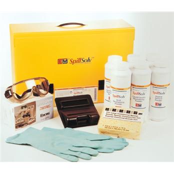 Choose from 6 different kitsHigh capacity neutralizersWall-mountable or portable caseShaker-top containersNeutralization indicated by color changeUses less neutralizer which provides faster cleanups and less expense. Forms into small clumps making clean-up and disposal quicker and simpler. Sturdy, bright yellow case is lightweight and resists deterioration. Shaker-top bottles eliminate having to scoop neutralizers out of a container. Replacement kits contain neutralizers only.Multi-Purpose Spill Kit (8237A01 / A03)For acid, caustic and solvent spillsKit contains 2 x 1 kg Acid Neutralizer; 2 x 0.9 kg Caustic Neutralizer; 2 x 0.5 kg Volatile Adsorbant Powder; 1 pair splash goggles with ventilation; 1 pair Nitrile gloves; 6 heavy-duty disposal bags that measure 14” x 20” x 4 mil; 4 disposable plastic scoops and scrapers; a large sponge for residue cleanups and a treatment guide.Acid Spill Kit (8237A05 / A07)Kit contains 6 x 1 kg Acid Neutralizer; 1 pair splash goggles with ventilation; 1 pair Nitrile gloves; 6 heavy-duty disposal bags that measure 14” x 20” x 4 mil; 4 disposable plastic scoops and scrapers; a large sponge for residue cleanups and a treatment guide.Solvent Spill Kit (8237A09 / A11)Kit contains 6 x 0.5 kg Volatile Adsorbant Powder; 1 pair splash goggles with ventilation; 1 pair Nitrile gloves; 6 heavy-duty disposal bags that measure 14 " x 20 " x 4 mil; 4 disposable plastic scoops and scrapers; 1 large sponge for residue cleanups and a treatment guide.Caustic Spill Kit (8237A13 / A15)Kit contains 6 x 0.9 kg Caustic Neutralizer; 1 pair splash goggles with ventilation; 1 pair Nitrile gloves; 6 heavy-duty disposal bags that measure 14 " x 20 " x 4 mil; 4 disposable plastic scoops and scrapers; 1 large sponge for residue cleanups and a treatment guide.Safety Accessories Replacement Set for multi-purpose, acid, solvent and caustic kits (8237A17)Kit contains a pair of splash goggles with ventilation; a pair of Nitrile gloves; 6 heavy-duty disposable bags that measure 14 " x 20 " x 4 mil; 4 disposable plastic scoops and scrapers and a large sponge for residue cleanups.Formaldehyde Spill Kit (8237A19 / A21 / A23)Kit contains 6 x 1 L Formaldehyde 2 Component Neutralizer (six 950 mL bottles of formaldehyde neutralizer base and six 50 mL neutralizer activator); 1 x 200 g Formaldehyde Absorbent and Immobilizer; two heavy-duty spray heads; a pair of splash goggles with ventilation; a pair of Nitrile gloves; six heavy-duty disposal bags that measure 14 " x 20 " x 4 mil; four disposable plastic scoops and scrapers; a large sponge for residue cleanups and a treatment guide.Formaldehyde Safety Accessories Kit contains two heavy-duty spray heads; a pair of splash goggles with ventilation; a pair of Nitrile gloves; six heavy-duty disposal bags that measure 14 " x 20 " x 4 mil; four disposable plastic scoops and scrapers; a large sponge for residue cleanups.Mercury Spill Kit (8237A25)Kit contains one small, see-through, portable poly container; one 750 g shaker bottle Mercury Immobilizer; one pair of clear protective glasses; two pairs of blue N-DEX Nitrile gloves; one collector pan and brush; three heavy-duty disposal bags that measure 14 " x 20 " x 4 mil; a spray bottle and a treatment guide.