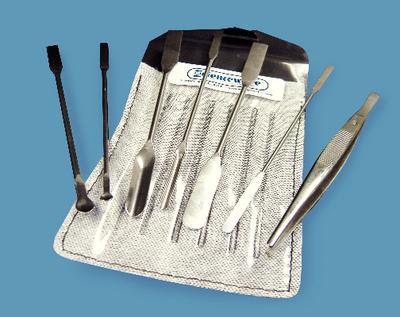 Micro Spoon and Spatula Sampling Set^ Kit comprised of 6 versatile double-headed tools as well as tweezers. 2 spoons and 4 spatulas. Perfect for working with miniscule amounts of chemicals. Each tool has two different end shapes. Polished stainless steel. Convenient tool case included.