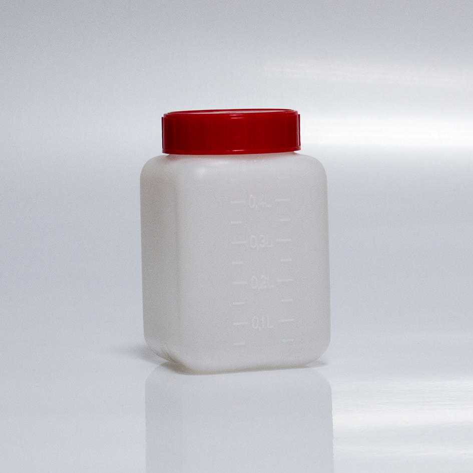 Bottle^ Square bottle, HDPE graduated, 58mm red screw cap, Sterile SAL 10-3, Color of the secondary body : Red, Height (mm) : 122.00, Length (mm) : 76.00, Type of closure : with wad, Size: 500ml