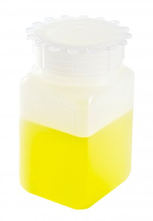 Convenient square design saves space. The integrity of the seal is insured by the additional internal plug. Hole in closure for attachment of tag. Maximum temperature for High Density Polyethylene is 110°C.