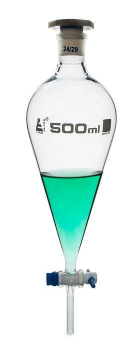 Eisco Labs Borosilicate glass separating funnel - Pear shaped, cap. 500ml, Socket size 24/29, Made of borosilicate glass with interchangeable plastic stopper and PTFE key stopcock. This unit is ungraduatedAutoclavable, with superior chemical durability. Low temperature gradient- can withstand high temperatures & thermal shocks. Eisco Labs Borosilicate glass has the following heat tolerances: Strain Point -515°C | Annealing Point 565°C | Softening Point 820°C.Eisco Labs proudly manufactures its own products using state-of-the-art equipment, and following the highest standards of quality control.Each product is carefully designed by a team of laboratory professionals and experienced engineers with quality and durability in mind. They are manufactured with only the highest grade, raw materials and according to international quality standards to ensure that they can withstand use in even the toughest laboratory environments.