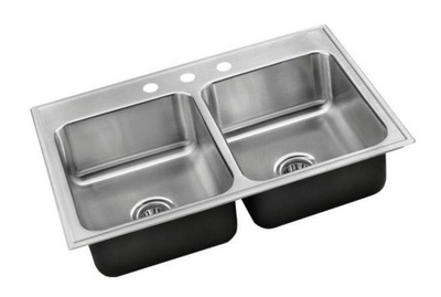 Double Compartment Sink with Ledgeback^ Fabricated of Type 304, 18-8 stainless steel with polished interior and top surfaces. Thoroughly sound deadened. Self-rimming; punched center receives cup strainer. Faucet ledge width: 11.4cm. OD: 55.8x83.8cm. ID: 40.6x35.5cm. Depth: 20.3cm.