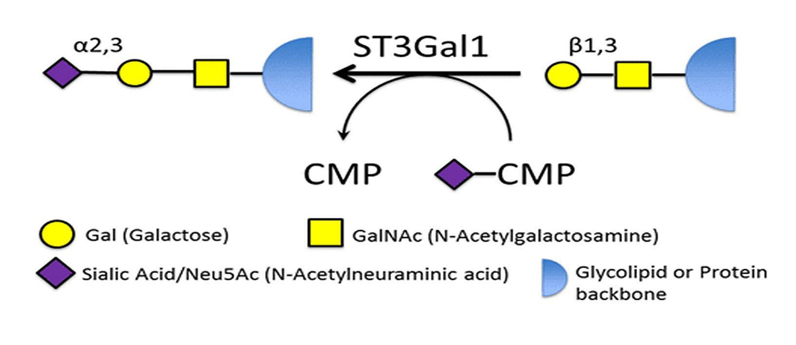 ST3Gal1 Recombinant 5ug^ ST3Gal1 Recombinant, Source Insect cells, Species: Human, Purity by SDS-PAGE > 90%, Synonyms: CMP-N-acetylneuraminate-beta-galactosamide-alpha-2,3-sialyltransferase 1, Gal-NAc6S, Gal-beta-1,3-GalNAc-alpha-2,3-sialyltransferase, SIATFL, ST3Gal I, Size: 5ug
